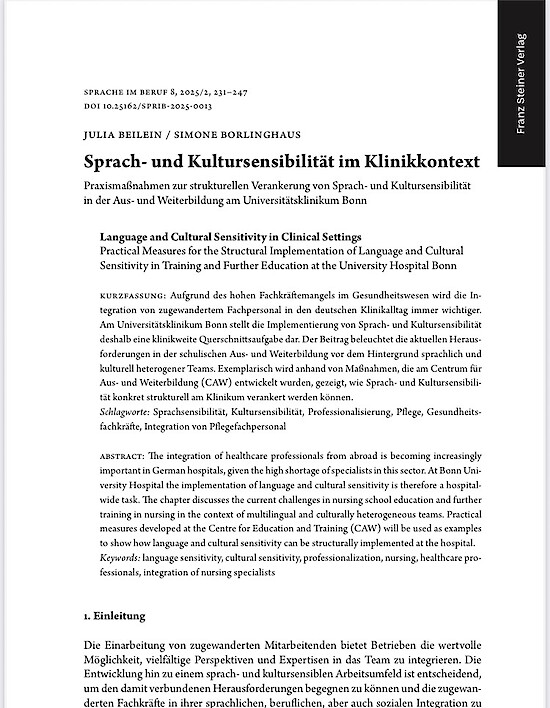 Im Ende November 2025 erschienen Heft der Zeitschrift Sprache im Beruf berichten wir von den am Centrum für Aus- und Weiterbildung implementierten Maßnahmen und wie Sprach- und Kultursensibilität in Ausbildung, Weiterbildung und klinikweit umgesetzt werden können.