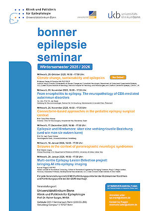 Das nächste Bonner Epilepsie Seminar startet wieder am Mittwoch, den 29. Oktober 2025 als Präsenzveranstaltung an der Klinik und Poliklinik für Epileptologie und als Livestream per Zoom.