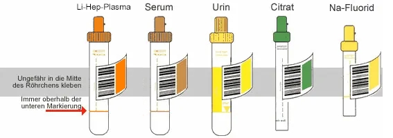Die Barcode-Etiketten werden bei Lithium-Heparin Plasma- , Serum-, Urin-, Citrat- und Na-Fluorid-Gefässen in Längsrichtung ungefähr in die Mitte des Röhrchens geklebt.