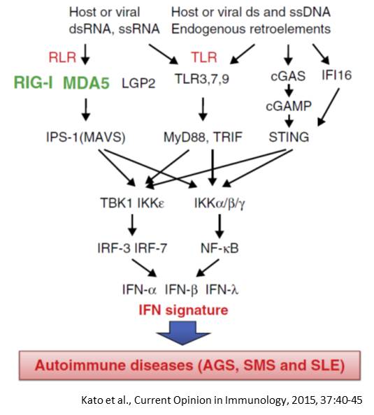 Two key molecules in interferonopathies are retinoic acid Inducible Gene I (RIG-I) and Melanoma Differentiation Associated Gene 5 (MDA5). Mutations in both corresponding genes (DDX58 respecively IFIH1) could be connected to the development of ADs and interferonopathies like SLE, SMS, AGS, T1D, MS and psoriasis.
