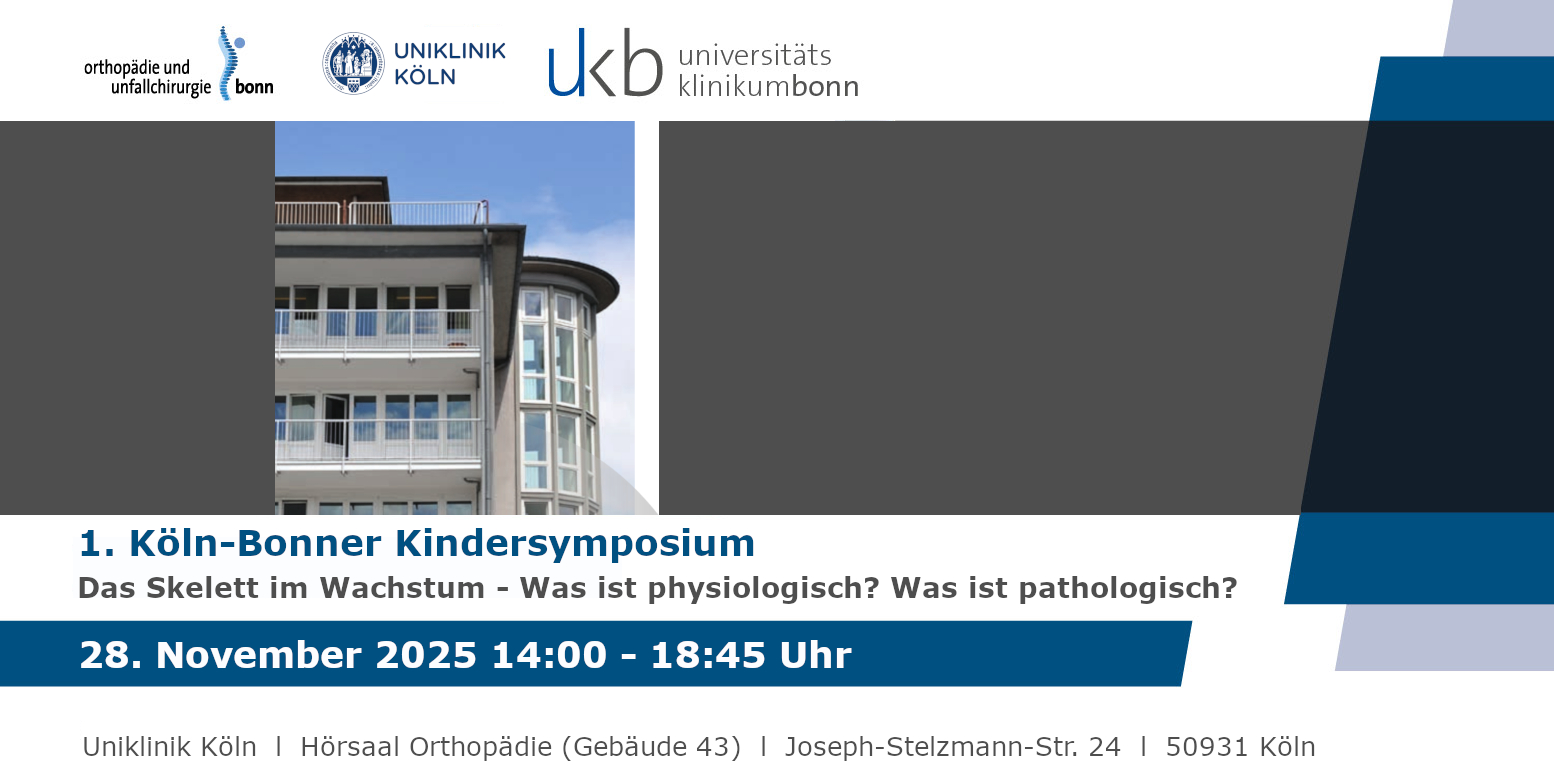 Sehr geehrte Kolleginnen und Kollegen, liebe Freunde der Kinderorthopädie, wir freuen uns sehr, Sie zum 1. Köln-Bonner Kinderorthopädie Symposium einzuladen! In der täglichen klinischen Praxis begegnen uns immer wieder kinderorthopädische Fragestellungen, bei denen es darauf ankommt, das Normale vom Pathologischen sicher zu unterscheiden. Gerade im Kindesalter ist diese Differenzierung oft anspruchsvoll – und doch essenziell für eine zielgerichtete Diagnostik und Behandlung sowie zur Vermeidung unnötiger Maßnahmen. Unser Symposium widmet sich daher bewusst den klassischen Symptomen aus dem kinderorthopädischen Alltag. In praxisnahen Vorträgen möchten wir gemeinsam typische Befunde beleuchten, diagnostische Entscheidungshilfen geben und Sicherheit im Umgang mit häufigen klinischen Situationen vermitteln.
