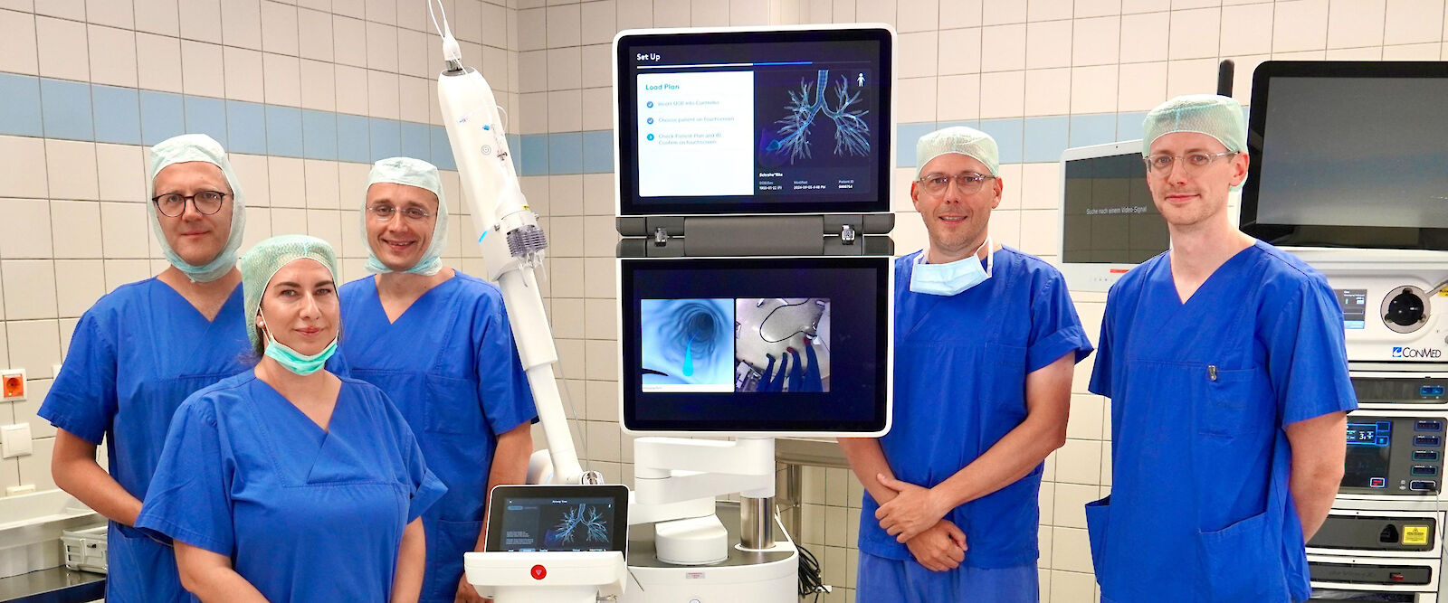 Die Klinik für Thoraxchirurgie am UKB verfügt seit August 2024 über das bahnbrechende roboter- und KI-assistierte Bronchoskopie-System ION und setzt dieses als erstes Zentrum in Deutschland in der regulären Patientenversorgung ein. Das ION-System ist ein hochmodernes Navigationsbronchoskop, das es ermöglicht, selbst kleinste periphere Lungenrundherde aufzuspüren und gezielt mithilfe eines im OP direkt eingesetzten Cone-Beam-CT zu biopsieren – vor allem in den peripheren Lungenabschnitten, die bisher mit herkömmlicher Bronchoskopie kaum oder gar nicht erreichbar waren.